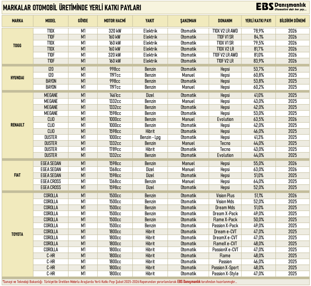 2026 Yılında Otomobil Üretiminde Hangi Marka Ne Kadar Yerli Katkı Payına Sahip ?