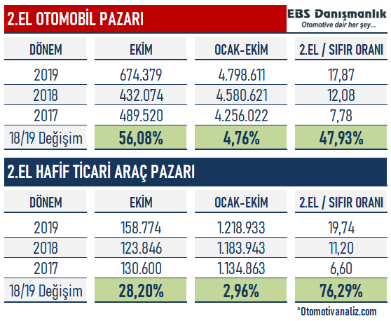 Ekim itibarıyla yüzde 56 artış ile 674 bin adedi geçerek tüm zamanların rekorunu kıran 2. el piyasasının, 2019’un son 2 ayında toplam 1,2 milyona ulaşması bekleniyor. İlk 10 aylık tabloda yüzde 4,76 büyüyerek 4,8 milyon adede ulaşan pazarın yılı yaklaşık 6 milyon otomobil satışıyla tamamlayacağı öngörülüyor.