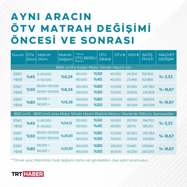 Karara göre binek araçlar için Özel Tüketim Vergisi (ÖTV) matrahları değişti. Buna göre, yüzde 45’lik ÖTV diliminde yer alan araçların matrah limiti 85 bin liradan 92 bin liraya yükseldi. Yüzde 50’lik ÖTV dilimindeki araçlarda da matrah limiti ise 130 bin TL’den 150 bin TL’ye çıkarıldı. Son yıllarda satış grafiği sürekli yükselen elektrikli araçlarda ise yüzde 45’lik ÖTV diliminin üst sınırı 114 bin lira olarak belirlendi. Ayrıca, 114 bin lira ile 170 bin lira arasında değere sahip olan araçlar için ise yüzde 50 ÖTV uygulanması kararı alındı.